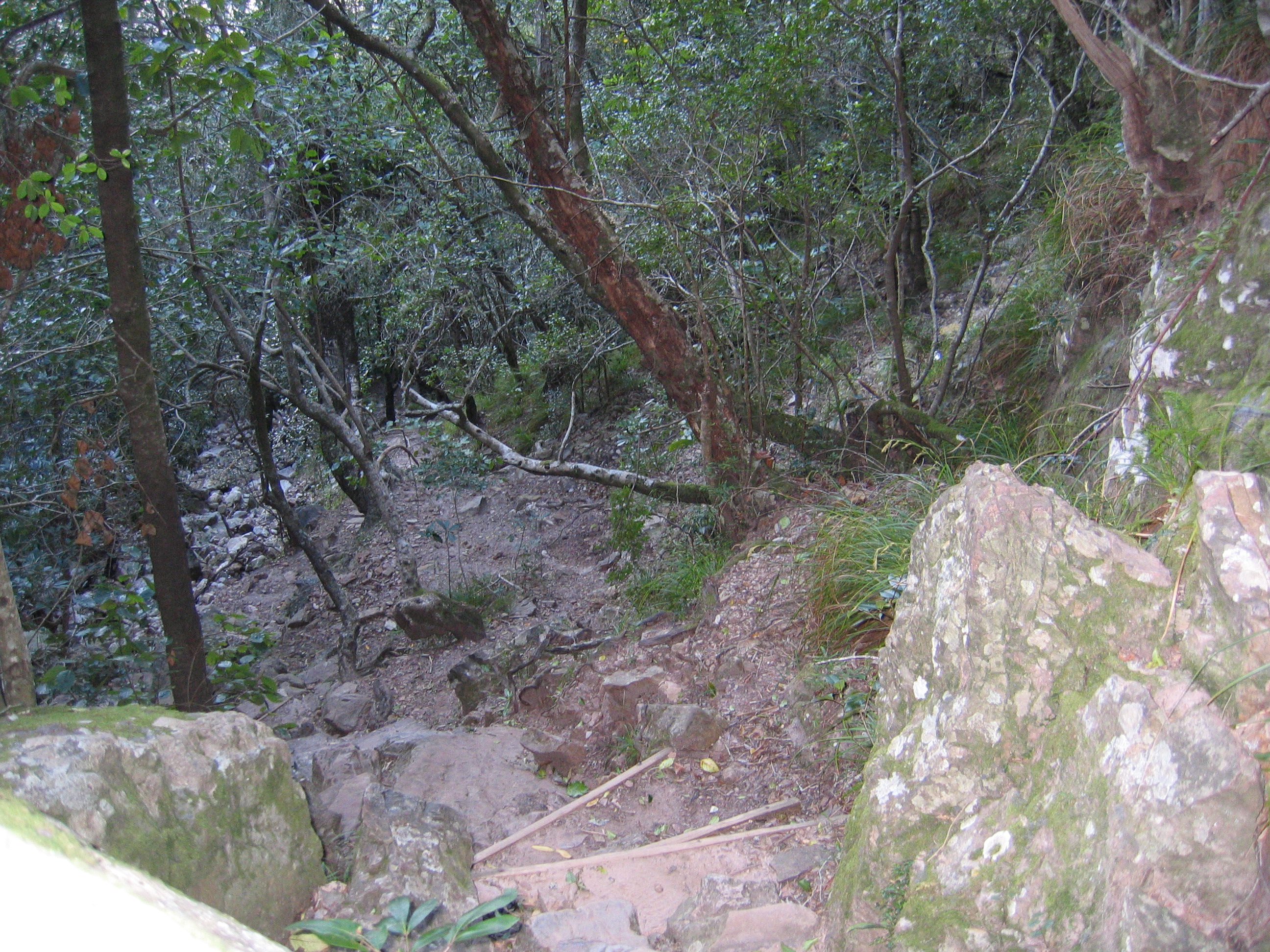 So we head up Skeleton Gorge. There is an exercise I do in the gym whereby I hold two dumbbells and step up and down on a bench about one and a half feet high. I do that 24 times (about), rest, then do it again. This hike was basically that, but with no breaks between sets and about 200 repetitions. My legs were burning. My lungs were burning. And I got dizzy. I had brought plenty of water, but I was starting to fear whether I’d make it. The dizziness, I think, was an after-affect of the cold and clearly a sign of dehydration. I had brought a packet of a powder they use here called “Re-Hydrate” and poured it into my water bottle. It included electrolytes and other stuff. That, I think, made the difference between making it and not. My dizziness started to clear up and didn’t occur any more after that.