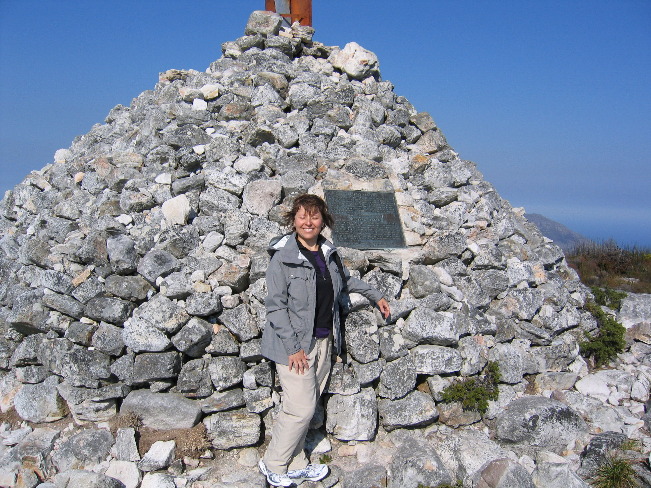 We took Skeleton Gorge to Macleans Beacon, the official highest point on Table Mountain. You’d think we’d be done. But OH NO.  We still had the flat part of the mountain to reach. By now the winds had kicked in to the point that it was hard to stand up and, by the way, this part of the hike was literally along the edge of the cliff. The good news was the wind was blowing us against the mountain so the likelihood of getting knocked OFF the mountain was slim. Nonetheless, this was the more terrifying part of the hike. The guide said to stick close together (that was for me, obviously, since I was the one lagging behind). And we finally made it to the flat part of the mountain.