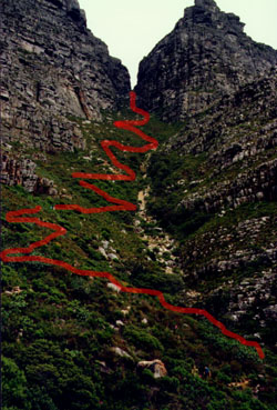This path takes you up Table Mountain via Skeleton Gorge. Please take note that it is a DIFFICULT and POTENTIALLY DANGEROUS climb, particularly in wet weather. Sections of the path are: