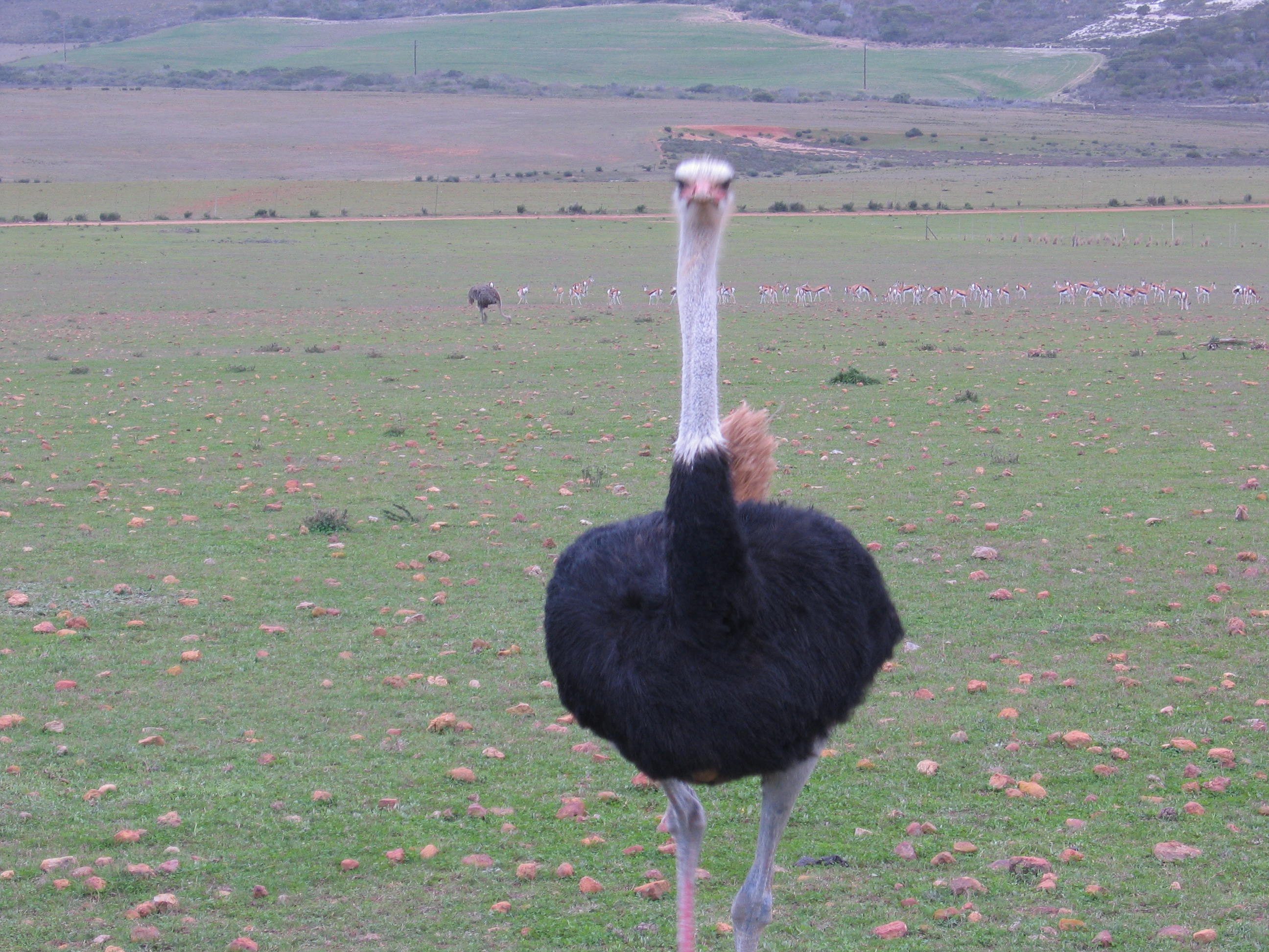 On our first ride, as we stopped at a clearing to see the springbok, a male ostrich came running right up to the truck. They are not dangerous so long as they don’t kick you. So if you stay in the vehicle you’ll be fine. The guide would try to shoo it away, but it was too curious about us. It’s a bit intimidating to have this huge, dumb bird come right up to you. The driver started the truck and revved the engine to no avail. And when she slowly started to drive away, it stepped in front of the vehicle and wouldn’t let us pass. Finally, it started to lead us along the road, got bored and eventually went in search of a female ostrich. On later drives this ostrich-in-heat would provide continuous entertainment as it chased around the females and bothered the other animals.