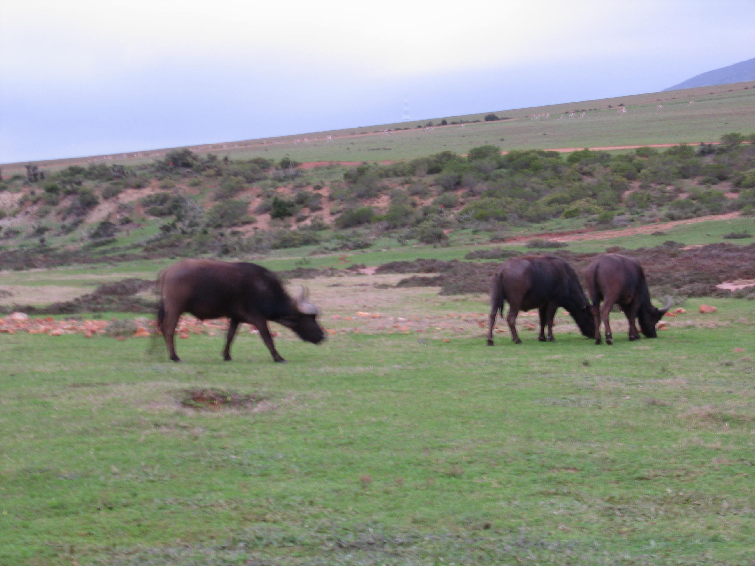 We were able to see a quasi-sample of the big five—buffalo, elephant, lion, leopard and rhino. Why “quasi”? For example, we saw a white rhino, which is far less dangerous and aggressive than the black rhino. We saw a Cape buffalo, not a true water buffalo. And while we saw cheetahs in pens, they’re not leopards. They’re called the big five because they are the most dangerous animals to hunters on foot. Of these, the buffalo is the most dangerous. It kills more humans than the other four animals combined. This is primarily because their warning signals are not obvious if you don’t know what to look for.