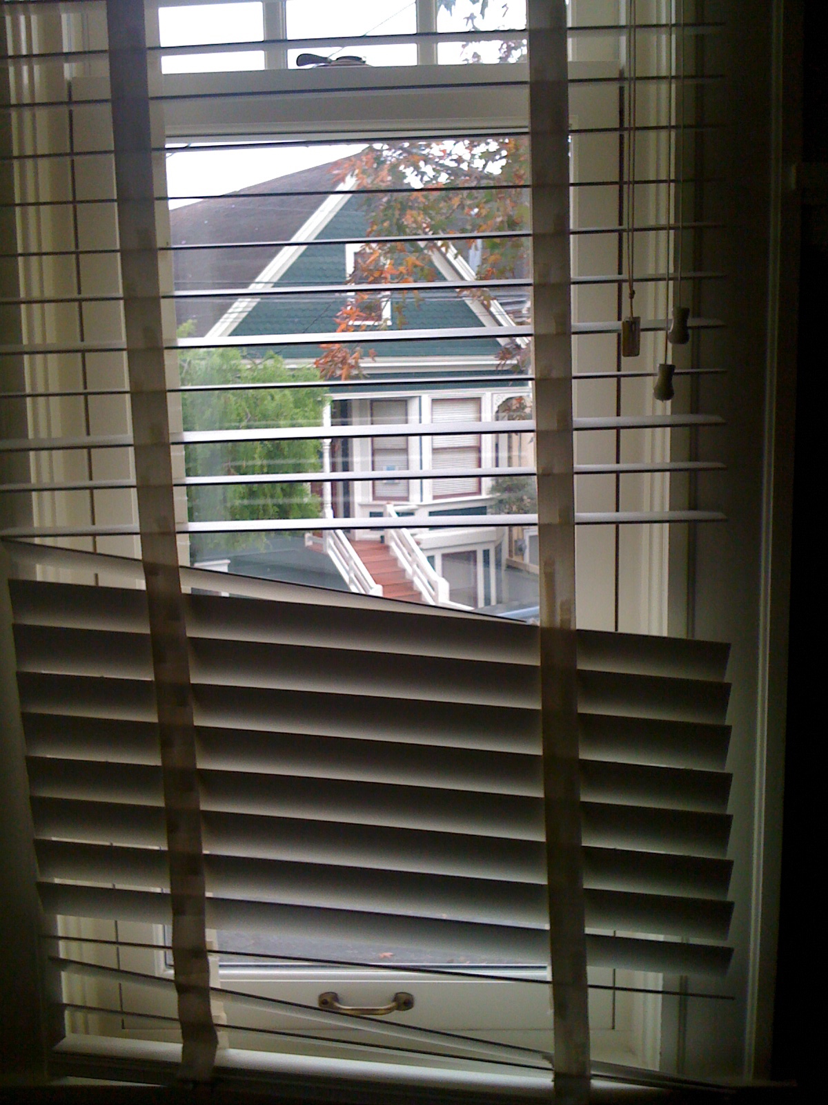The previous owners of our home were definitely into the “cottage” look for decor. We have been slowly minimizing that. I’m not sure what our “look” is, but I’m going to call it “Urban Villa.” That is, I like clean, contemporary lines mixed with the Italian/Mediterranean country villa feel. I’m not sure this will be successful but we’ll see. One of the big elements that we’ve needed to address were the white “country woods” blinds throughout the house. They worked perfectly well and we’d focused our energy (and $$) on other things like the kitchen. Well, now one of the fabric strips that holds the blinds together has disintegrated (sun exposure?) creating this askew look.