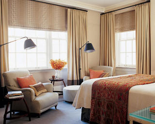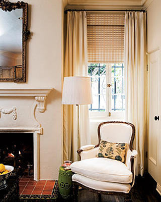 We will likely go with a layered treatment: a roller solar shade (that you can see through) with silky or gauzy or linen to-the-floor drapes. What I don’t want are big heavy valances that weigh down the look. They always remind me of really heavy eyebrows.